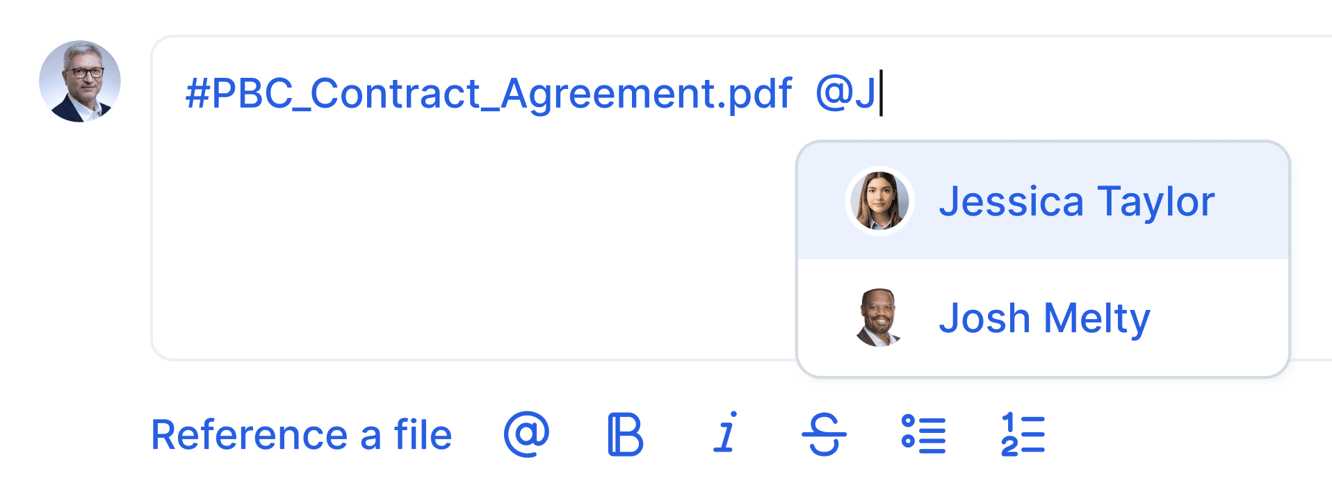 People and files in the project can be referenced and tagged. No need to explain which file you’re speaking of.